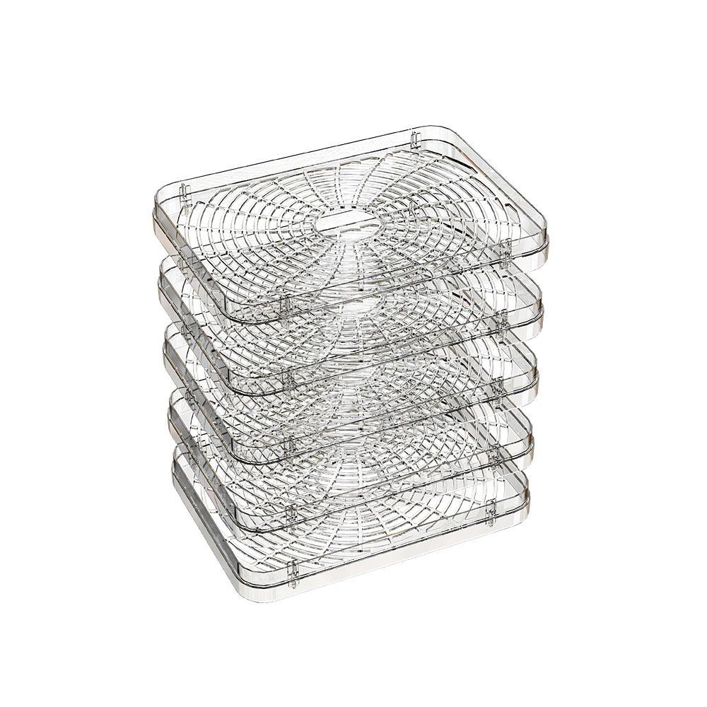 В комплект также входит универсальный поддон для пастилы или сбора капель (вы сами выбираете, какую задачу он будет выполнять во время сушки) и 5 мелкоячеистых сеток — с их помощью можно сушить мелкие ягоды, травы или орехи, не опасаясь, что они провалятся. Это особенно удобно, если вы часто экспериментируете с разными продуктами.