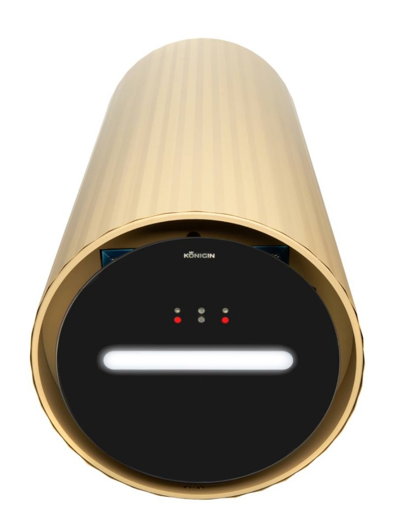 Данная модель оснащена системой управления, распознающей движения рук (жесты) под вытяжкой на стеклянной декоративной панели. Светодиодный индикатор, отображает текущую скорость работы вытяжки определенным цветом (синий, фиолетовый, зеленый, красный). Цвет диода отображается на поверхности варочной плиты, расположенного под вытяжкой.