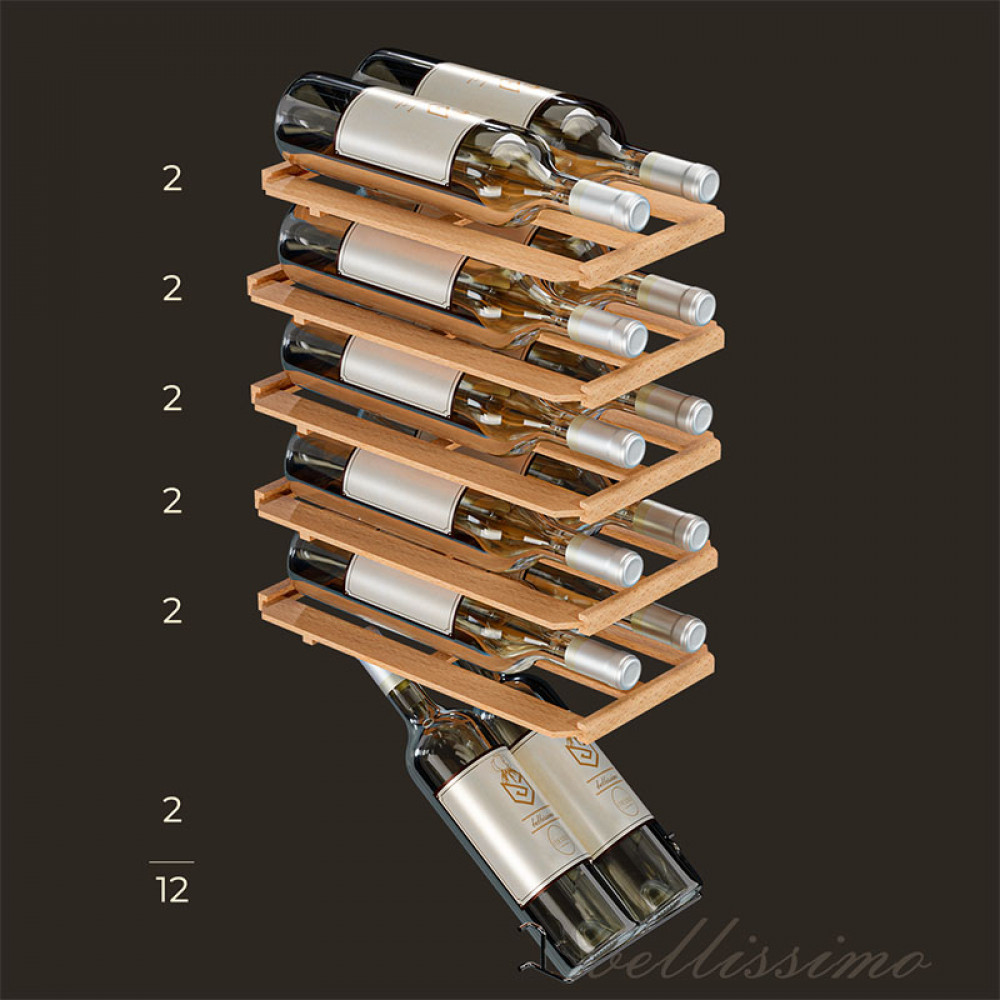В винный шкаф помещается 12 бутылок, и это оптимальный объём для тех, кто только начинает собирать коллекцию или предпочитает держать под рукой небольшой, но тщательно отобранный набор вин. При этом устройство не выглядит громоздким и отлично вписывается даже в небольшие помещения.