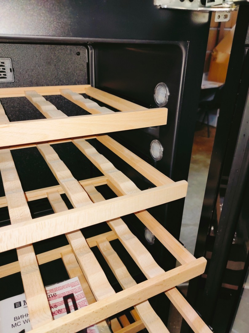 Полки из дерева обеспечивают безопасное размещение бутылок, а мягкая светодиодная подсветка придает шкафу элегантность.